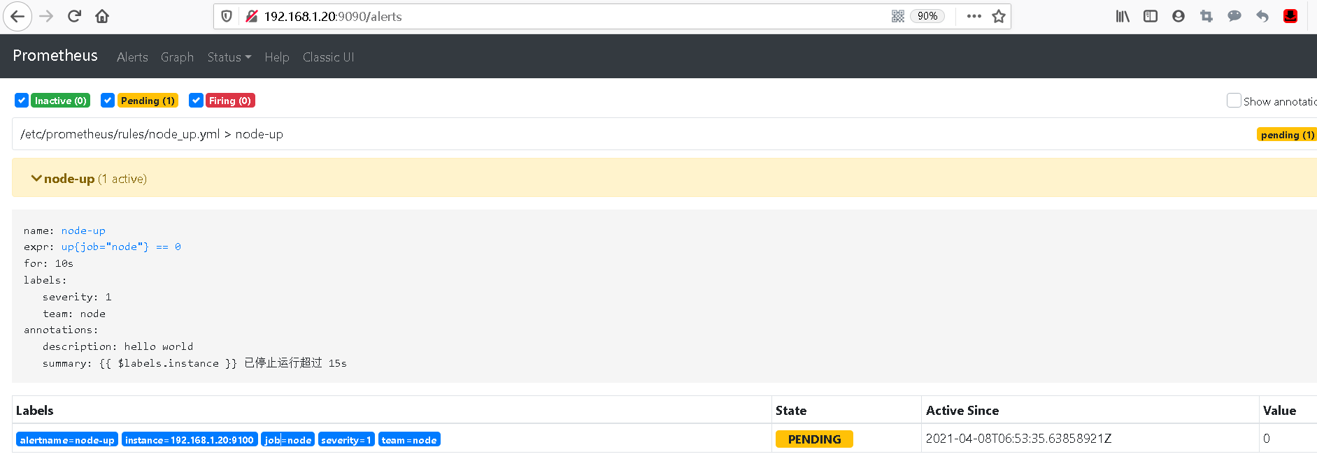 触发报警该规则会变更为Pending状态 ,等待15s如果没有恢复则会进入Firing状态