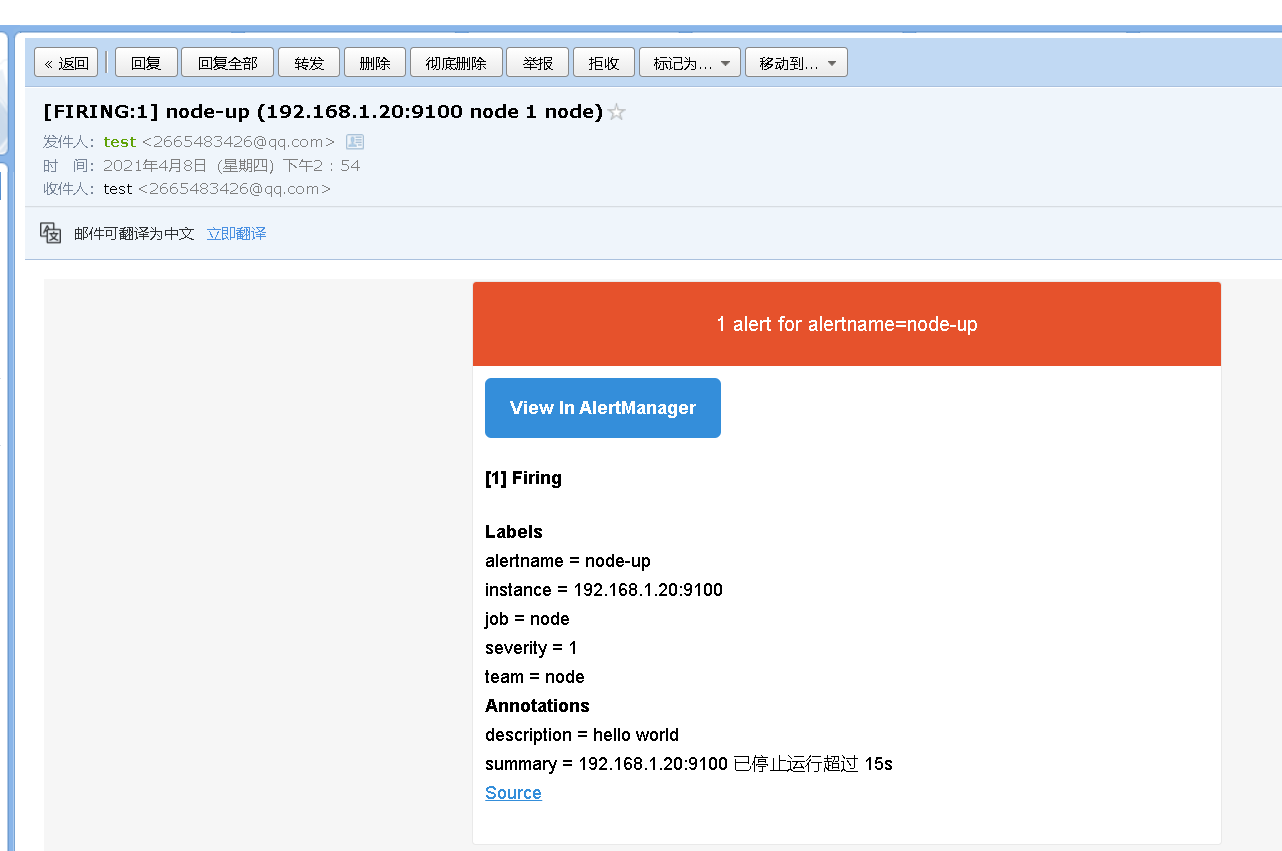 当你看到这条时,alertmanager已经拿到了告警数据,然后通过route路由到告警配置中,给配置中的邮箱进行报警