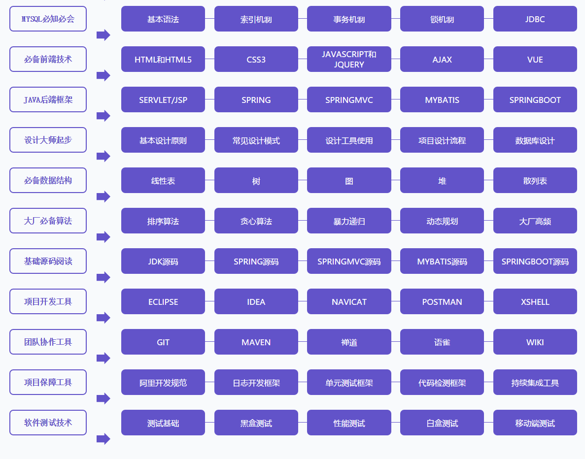 1. DOS常用命令 2. JVM、JRE、JDK之间的关系 3. Java开发环境的搭建:安装JDK,配置环境变量 4. Java入门程序(Java的开发流程) 5. Java的注释,标识符、标识符的命名规范 6. Java基本数据类型 7. 变量和常量的定义及初始化 8. Java的运算符 9. 运算符的优先级 10. Java分支语句之if...else 11. 循环的嵌套 12. 方法的定义 13. 方法的形参和实参 14. 方法的压栈 15. 方法的递归调用