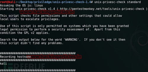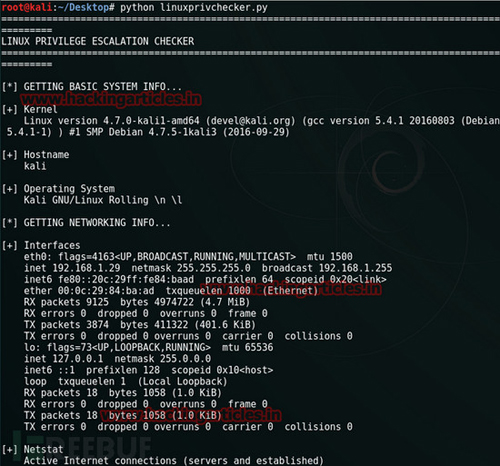 只需在终端键入python linuxprivchecke.py就可以使用该脚本,该脚本将枚举文件和目录的权限和内容。这个脚本和LinEnum工作原理大致相同并且在相关系统网络和用户获得的信息更详细。