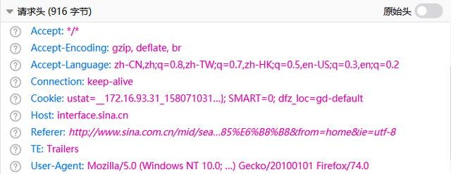 headers = { "Host": "interface.sina.cn", "User-Agent": "Mozilla/5.0 (Windows NT 10.0; Win64; x64; rv:74.0) Gecko/20100101 Firefox/74.0", "Accept": "*/*", "Accept-Language": "zh-CN,zh;q=0.8,zh-TW;q=0.7,zh-HK;q=0.5,en-US;q=0.3,en;q=0.2", "Accept-Encoding": "gzip, deflate, br", "Connection": "keep-alive", "Referer": r"http://www.sina.com.cn/mid/search.shtml?range=all&c=news&q=%E6%97%85%E6%B8%B8&from=home&ie=utf-8", "Cookie": "ustat=__172.16.93.31_1580710312_0.68442000; genTime=1580710312; vt=99; Apache=9855012519393.69.1585552043971; SINAGLOBAL=9855012519393.69.1585552043971; ULV=1585552043972:1:1:1:9855012519393.69.1585552043971:; historyRecord={'href':'https://news.sina.cn/','refer':'https://sina.cn/'}; SMART=0; dfz_loc=gd-default", "TE": "Trailers" }
