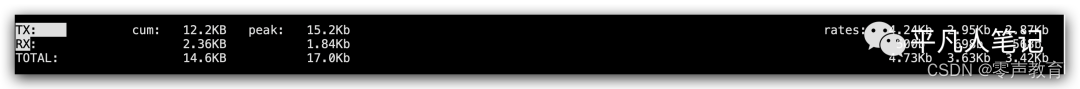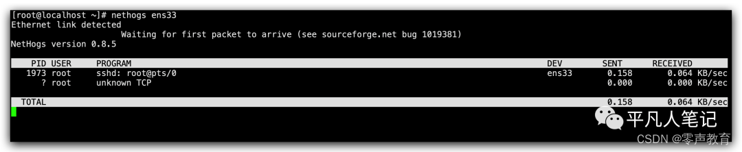 yum install nethogs# 查看进程占用带宽的情况nethogs ens33列出每个进程的收发流量的数据,找出哪个进程是最消耗流量的,能够更方便的让我们去定位哪个进程出的问题。