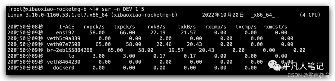# 使用sar每一秒统计一次网络接口的活动状况,连续显示5次sar -n DEV 15