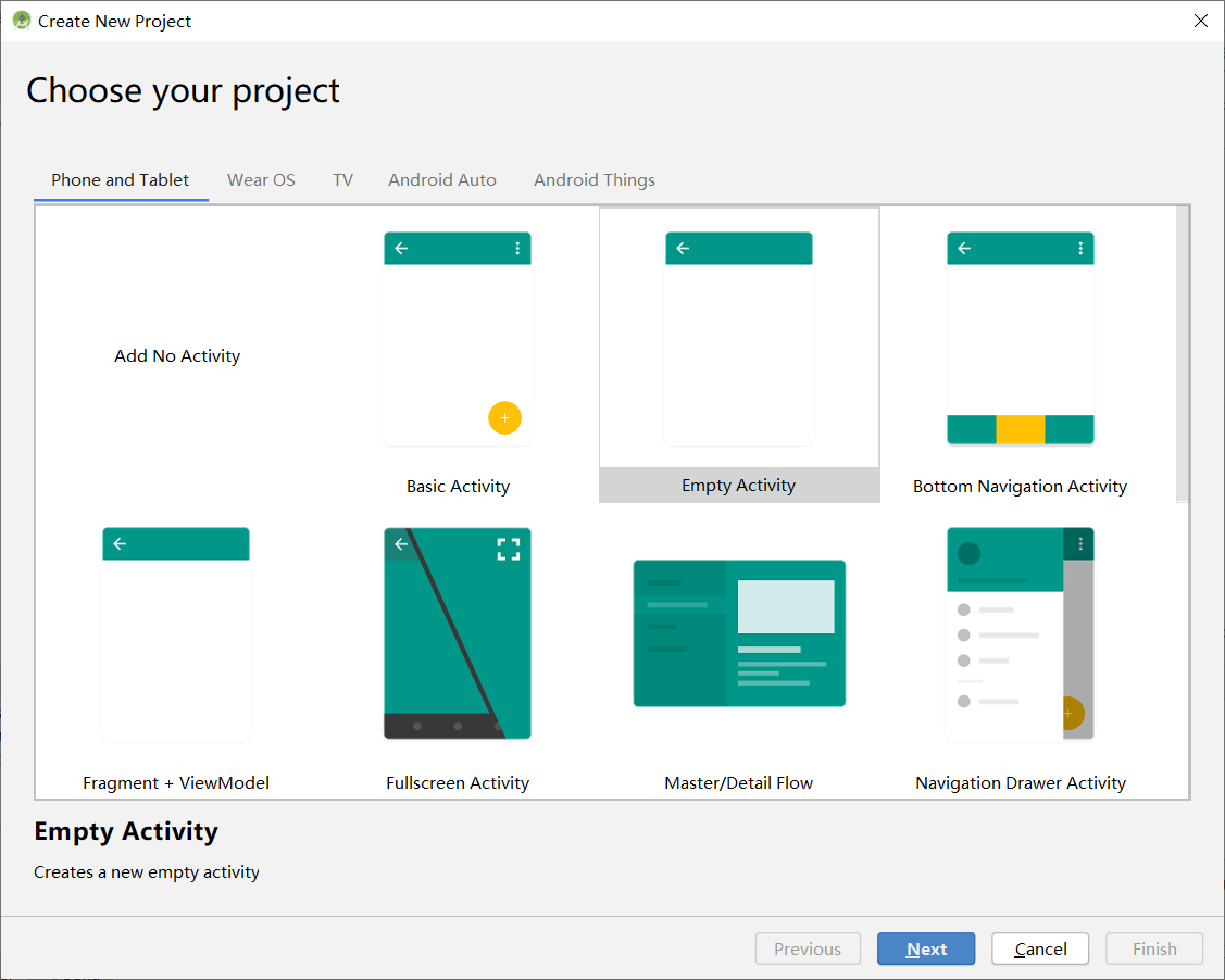 1、创建一个空项目(Empty Activity),点击“Next”,其他项目后面在介绍把。