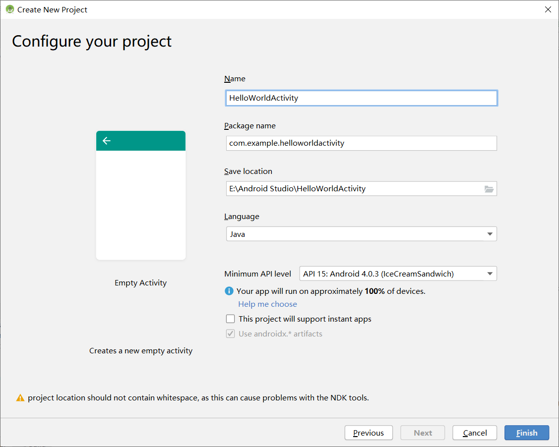 2、 命名工程,根据驼峰命名规范自行填写,这边就命名“HelloWorldActivity”,在“save location”一栏可以选择存储路径,语言一栏可以选择“Java”。最后点击“finish”完成。