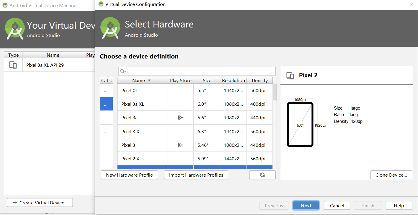3、点击“AVD Manager”,在这可以创建你想要的虚拟设备,但有的设备需要下载,我这边已经下好一个了,可以选中。