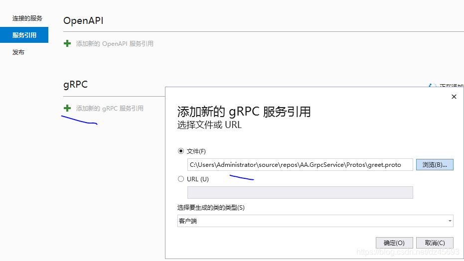 引用gRPC服务,步骤:右键项目添加=》服务引用弹出以下页面;