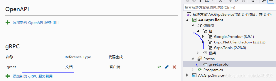 - Protos 文件(包含greet.proto)自动从AA.GrpcService项目拷贝