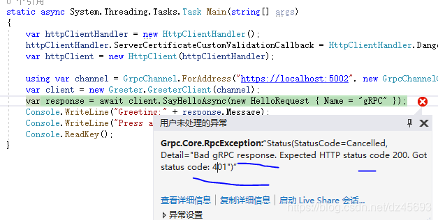 await context.Response.WriteAsync("Communication with gRPC endpoints must be made through a gRPC client. To learn how to create a client, visit: https://go.microsoft.com/fwlink/?linkid=2086909");