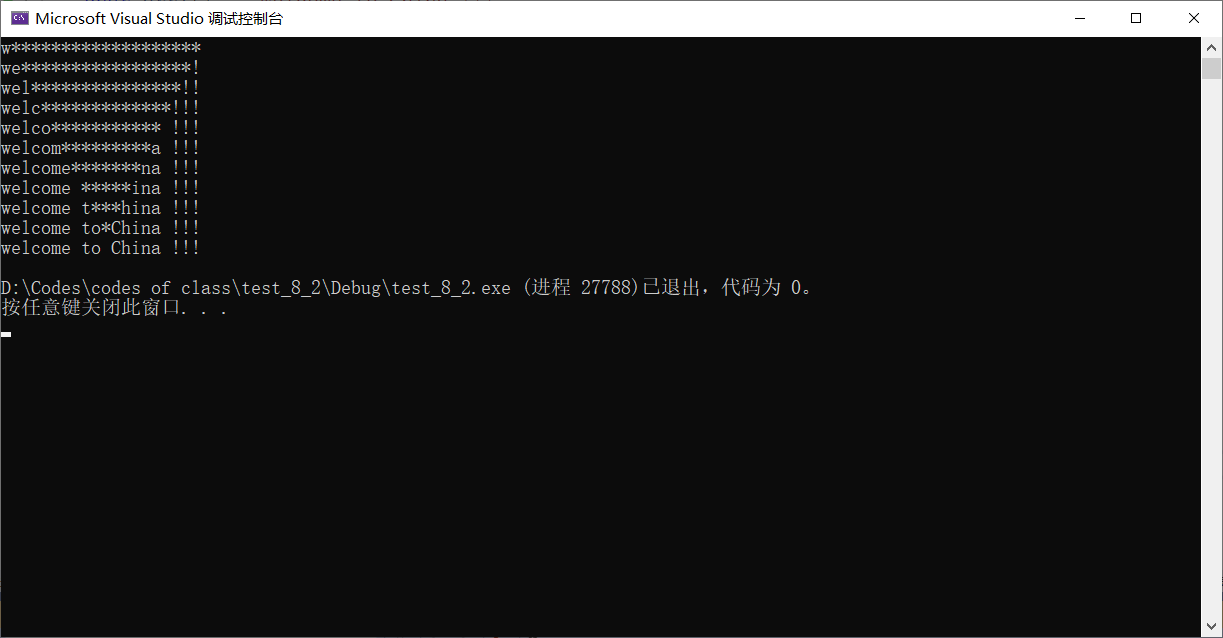当然如果觉得这样做太繁冗,不够简洁,我们可以每次打印之后使用 system ("cls");及时清空屏幕(需要注意的是,最好在while循环外再打印一次字符串,否则,最后一次打印的结果也会被清空),另外如果将*****用空格代替,将实现字符从两边向中间汇聚的效果看起来更加简洁。