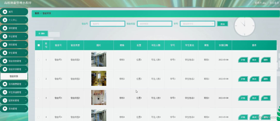 4、主页内容管理:管理员登录以后,可以对首页,个人中心,学院管理,专业管理,班级管理,学生管理,宿舍信息管理,宿舍安排管理,在线缴费管理,学生报道管理,留言板管理,系统管理进行详细操作。