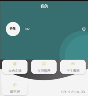 我的,学生在我的页面可以对宿舍安排,在线缴费,学生报道,留言板等详细信息进行操作,如图5-4所示。