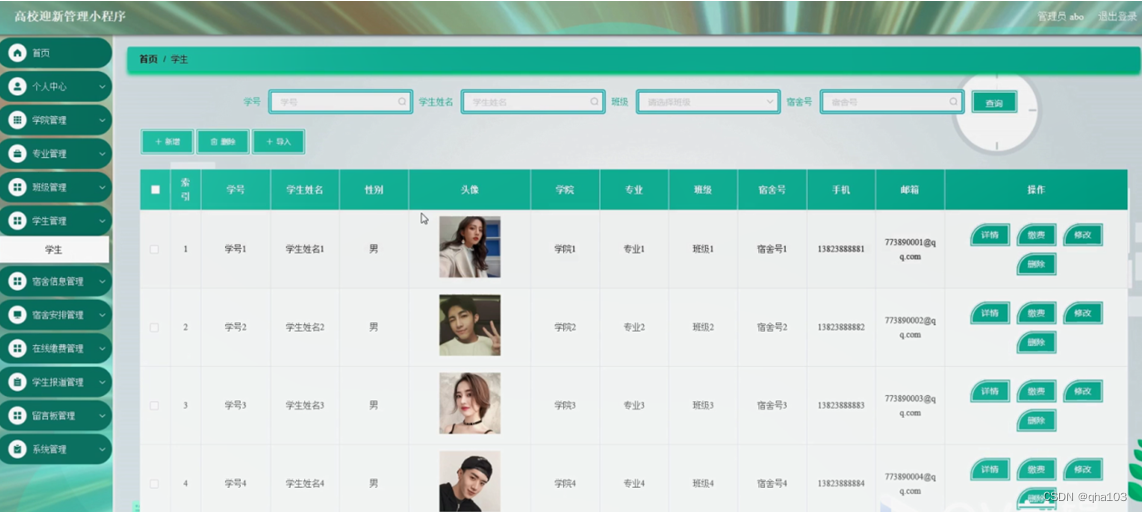 学生管理,在学生管理页面可以对索引,学号,学生姓名,性别,头像,学院,专业,班级,宿舍号,手机,邮箱等内容进行详情,缴费,修改和删除操作,如图5-8所示。