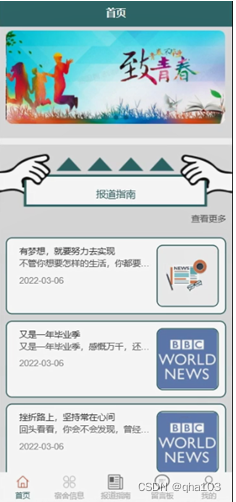 学生登陆系统后,可以对首页,宿舍信息,报道指南,留言板,我的等功能进行详细操作,如图5-2所示。