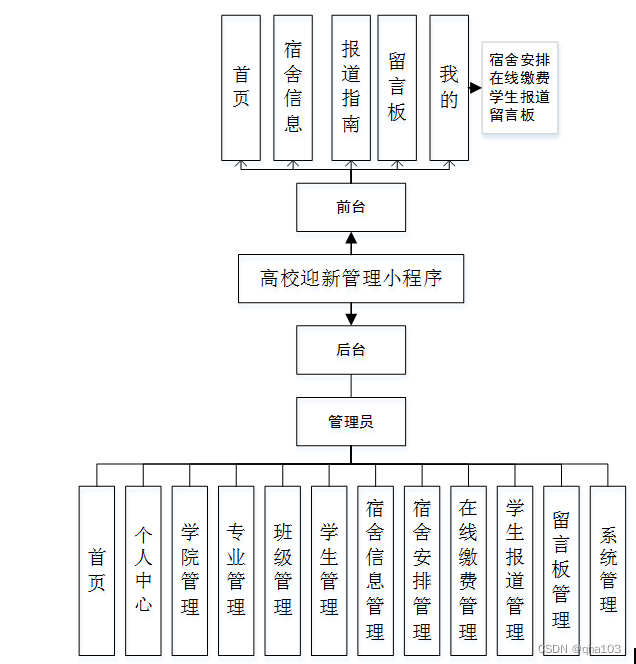 高校迎新管理小程序主要有两大模块。分别是前台模块由学生登录,后台模块由管理员登录;详细规划如图4-1所示。