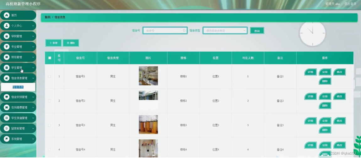 宿舍信息管理,在宿舍信息管理页面可以对索引,宿舍号,宿舍类型,图片,楼栋,位置,可住人数,备注等内容进行详情,安排,修改和删除操作,如图5-9所示。