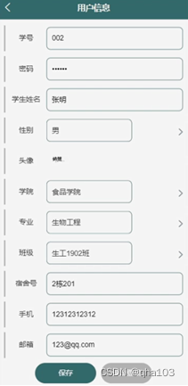 学生信息,在学生信息页面通过填写学号,密码,学生姓名,性别,头像,学院,专业,班级,宿舍号,手机,邮箱等内容进行保存或退出登录操作;如图5-5所示。