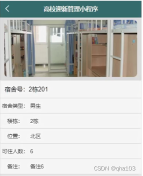 宿舍信息,在宿舍信息页面可以查看宿舍号,宿舍类型,楼栋,位置,图片,可住人数,备注等详细信息;如图5-3所示。