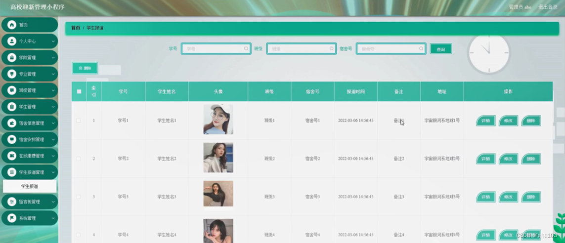 学生报道管理,在学生报道管理页面可以对索引,学号,学生姓名,头像,班级,宿舍号,报道时间,备注,地址等内容进行详情,修改,查看评论和删除等操作,如图5-12所示。