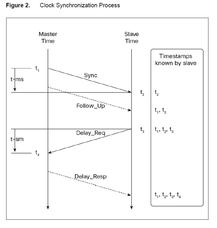 - PTP primary记录下它受到Delay_Req报文的时间。也就是时间戳t4。它发送包含时间戳t4的Delay_Resp报文给交换机secondary。现在PTP软件进程已经有了t1、t2、t3、t4。