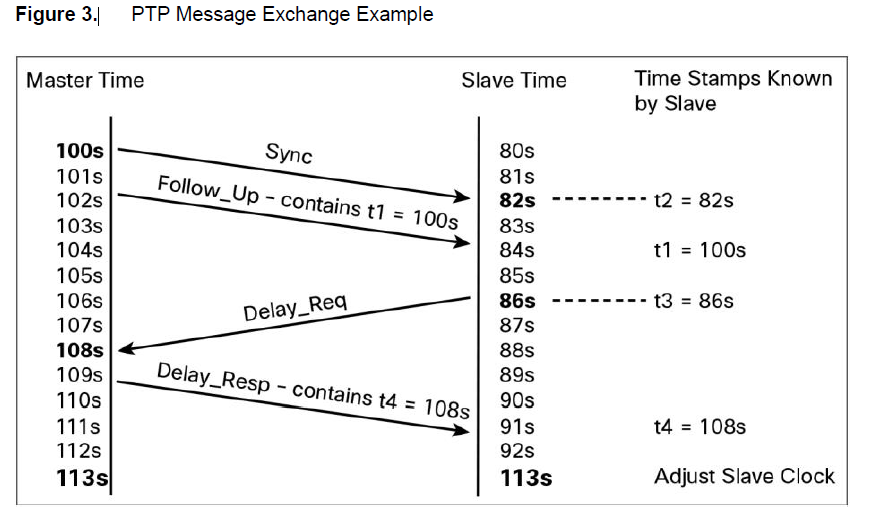 - 3100或者9000发送一个Delay_Req消息给primary。当Delay_Req报文离开转发ASIC的时候,离开的时间戳被记录下来。PTP软件进程存储这个时间戳,也就是t3。现在PTP软件进程已经有了t1、t2、t3。