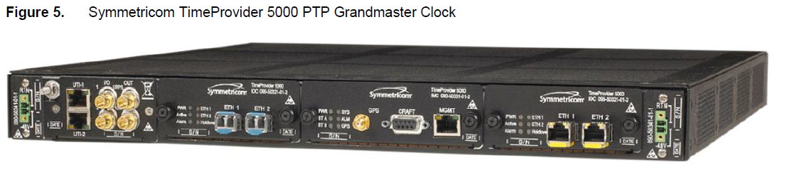 grandmaster clock一般是专用的设备。这个设备连接到GPS,它提供一个精确的时间源输入。然后这个primary clock就生成PTP包到整个网络上。Symmetricom TimeProvider 5000是一个PTP grandmaster时钟的例子:
