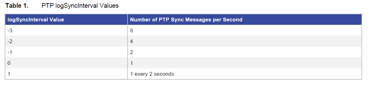 PTP logSyncInterval (sync interval)值表示,接口上每秒钟发送出去的PTP Sync报文的数量。