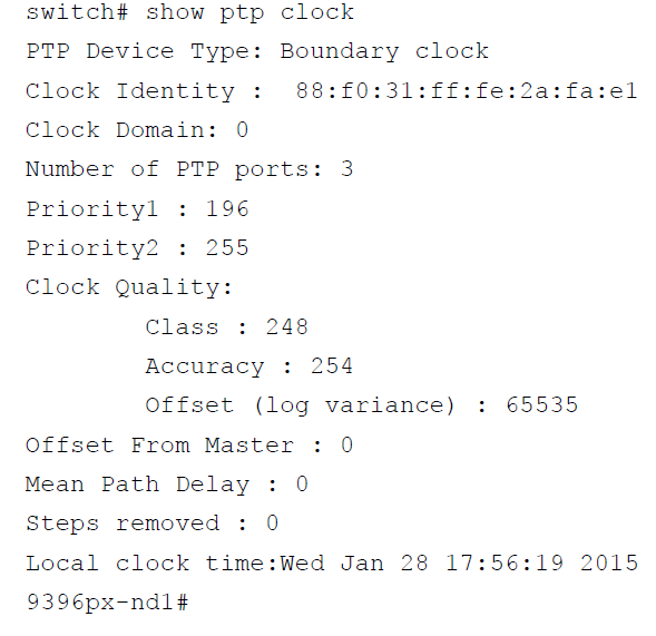 switch# show clock这个命令可以用来验证交换机时钟是和grandmaster时钟同步的。你不能够通过这个命令验证时钟的精确度。但是,如果你用了clock protocol ptp你可以至少验证时间和grandmaster匹配。