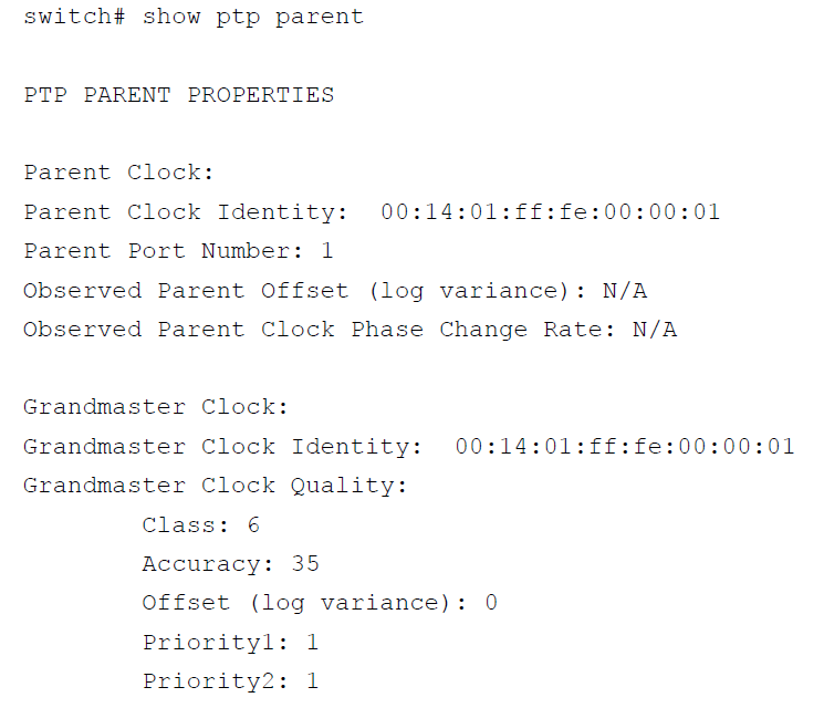 switch# show ptp parent这个命令展示了PTP parent的特性。这个在验证parent clock身份的时候很有用,以下是一个输出的例子: