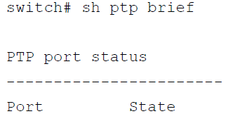 switch # show ptp brief这个命令展示了所有接口的PTP状态。一个PTP端口可以有以下4种状态中的一种: