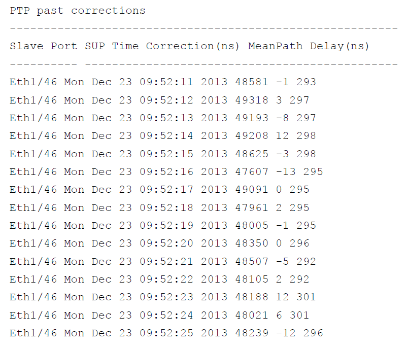 switch # show ptp corrections这个CLI命令展示最后几个PTP修正