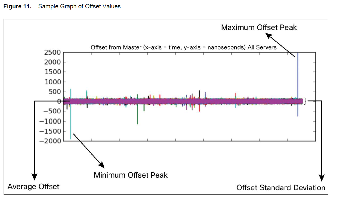 图11就是一个偏差图的例子,它表明了平均偏差、偏差标准差、最大最小峰值。纵轴是偏差值,横轴是PTP客户端集合。