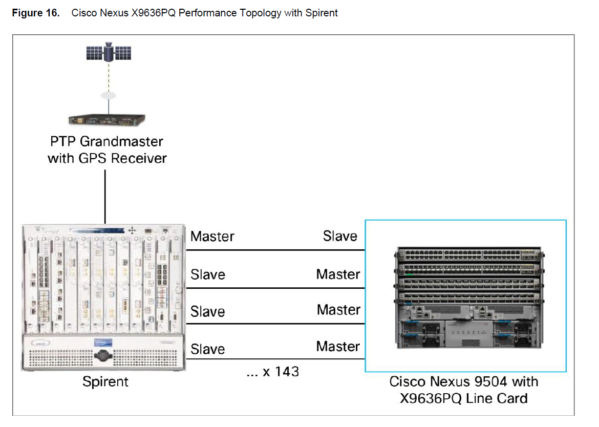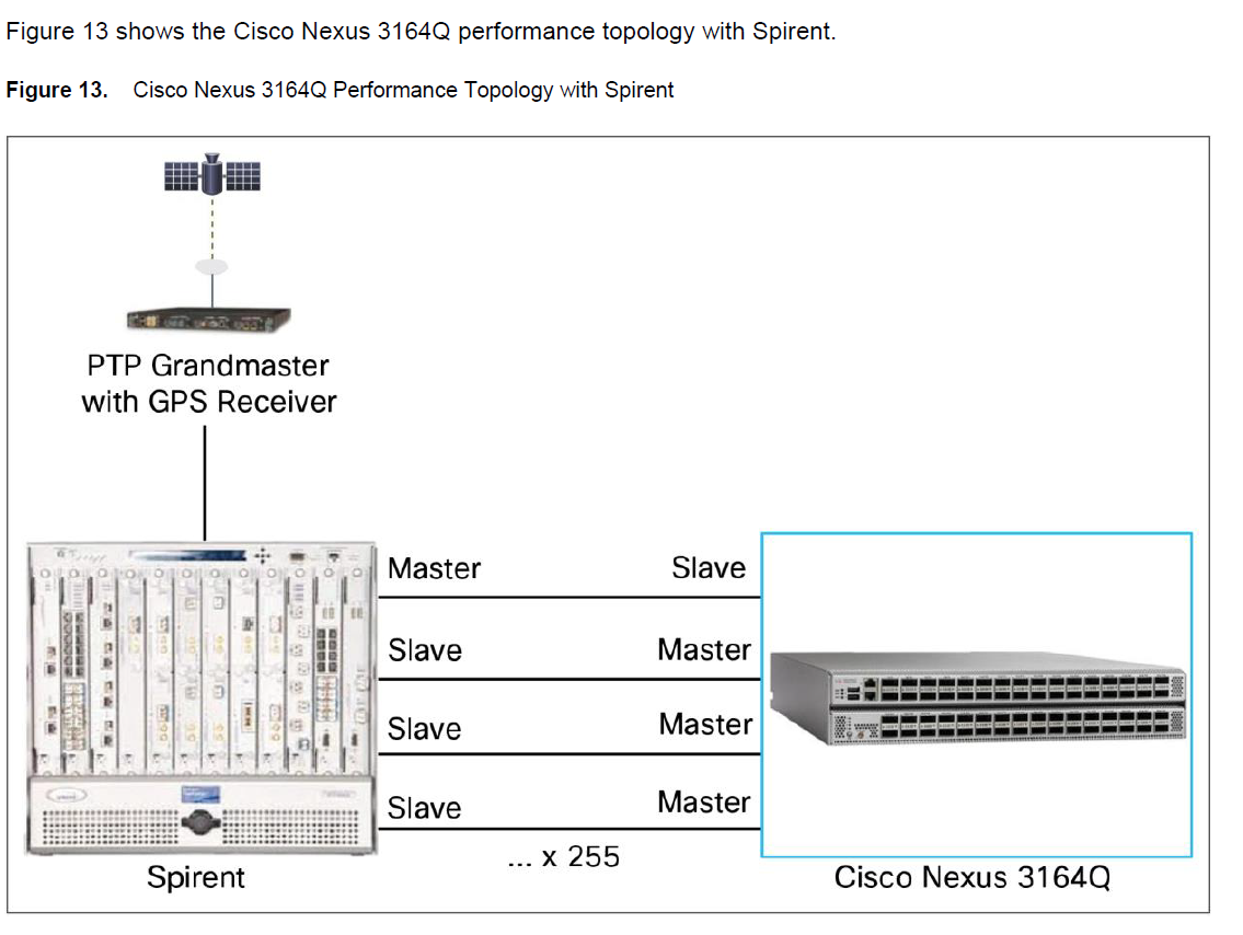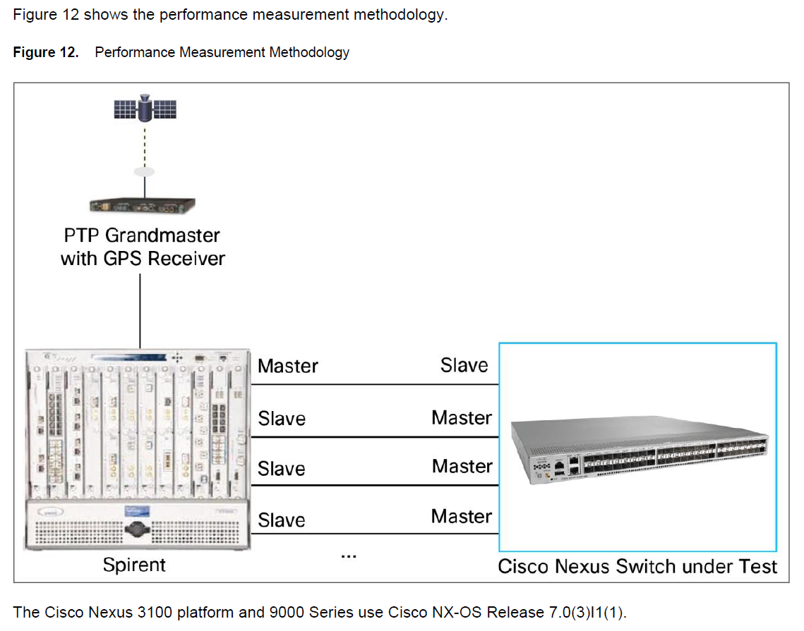 Spirent有一个primary port连接到交换机。Spirent剩下的接口作为PTP secondary从交换机接口接收时钟。因此Spirent可以计算从primary port发出去和从secondary接收到的时钟偏差。这个结果就表明了交换机的精度。