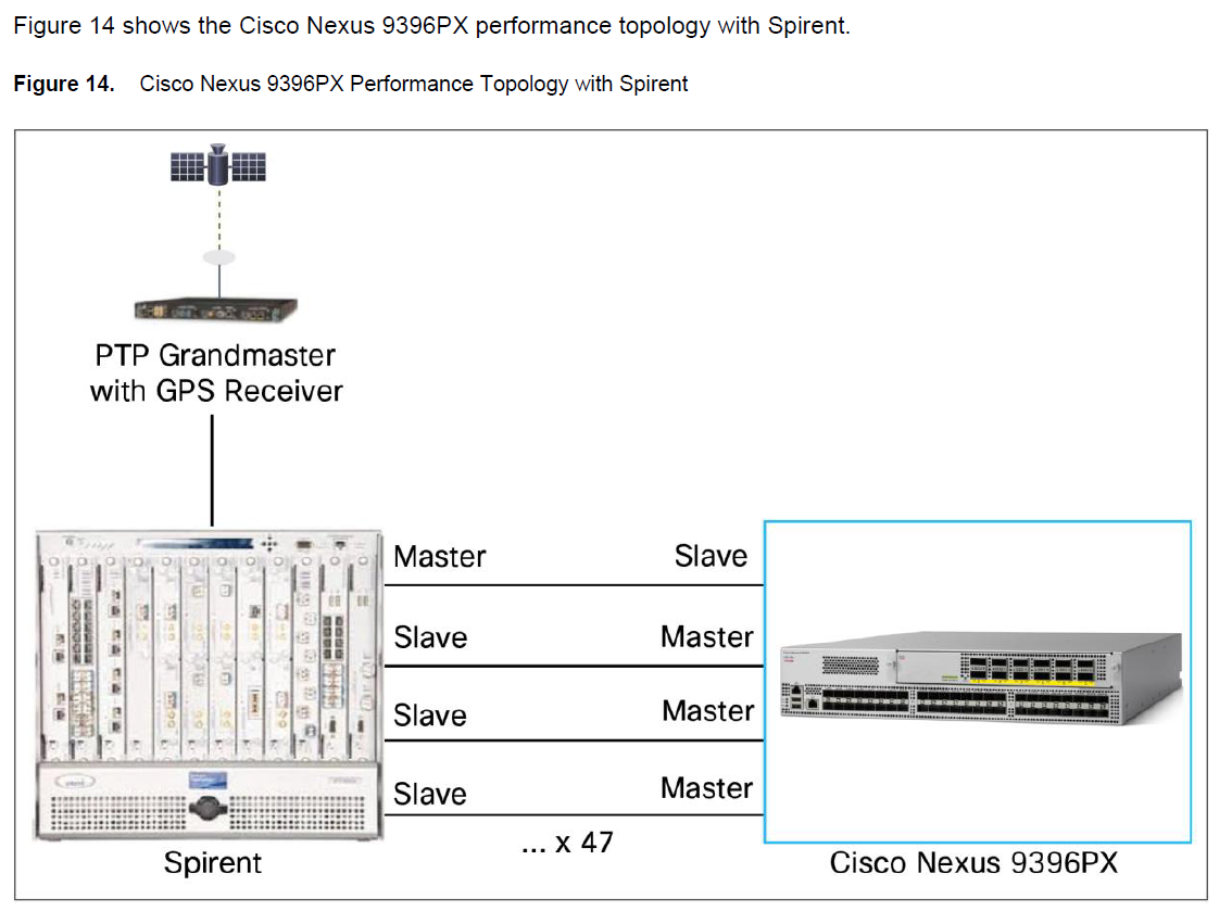 9396PX也有44个物理10G口连接到Spirent。也就是有43个 PTP secondary,另外加上4个仿真PTP secondary。总共有47个PTP secondary需要交换机提供时间。
