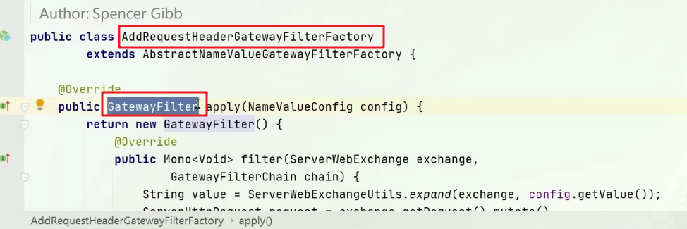 路由过滤器和DefaultFilter(默认过滤器)底层是一样的都被AddRequestHeaderGatewayFilterFactory(过滤器工厂)生产为GatewayFilter