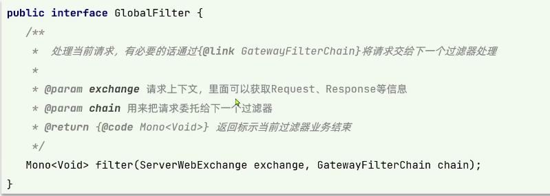 public Mono<Void> filter(ServerwebExchange exchange, GatewayFilterchain chain){