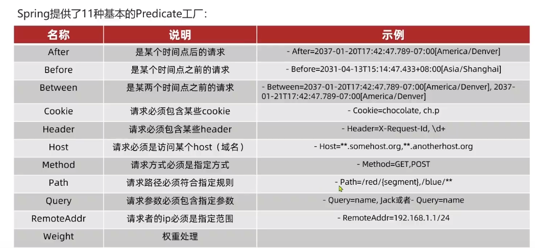 predicates: # 路由断言,也就是判断请求是否符合路由规则的条件