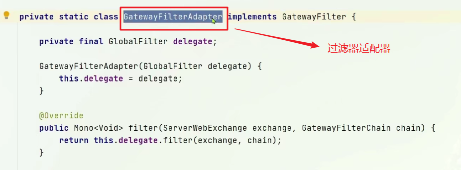 有一个叫过滤器适配器的东西 实现了GatewayFilter 内部又接收了一个GlobalFilter 传入适配器中 这样就把GlobalFilter 做了一个适配 变成了GatewayFilter