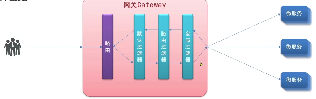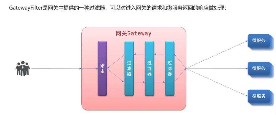 请求进入网关会碰到三类过滤器:当前路由的过滤器、 DefaultFilter、 GlobalFilter请求路由后,会将当前路由过滤器和 DefaultFilter、 GlobalFilter,合并到一个过滤器链(集合)中,排序后依次执行每个过滤器