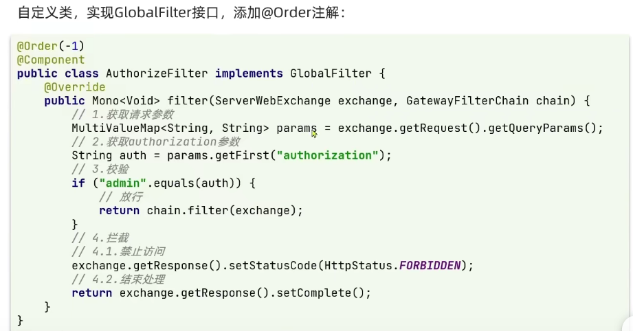 - Globalfilter通过实现 Ordered接口,或者添加@ Order注解来指定 order值,由我们自己指定