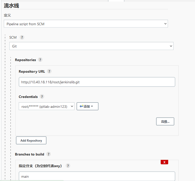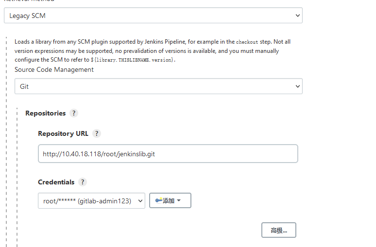 接下来配置共享库的仓库地址,我的仓库在gitlab中,所以这里填写的是gitlab的项目地址,(如果你用的是github可以使用github方式),如果仓库是私有的方式,需要在jenkins的凭据中添加一个账号用于下载共享库。