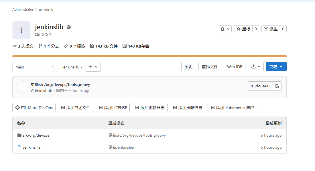 可以直接在github中创建一个公开类型的仓库,也可以创建私有类型的gitlab仓库,需要提前配置好仓库的认证凭据,这里使用gitlab创建了一个名为jenkinslib的项目作为共享库,并创建类文件和Jenkinsfile文件 /src/org/devops/tools.groovy 和Jenkinsfile: