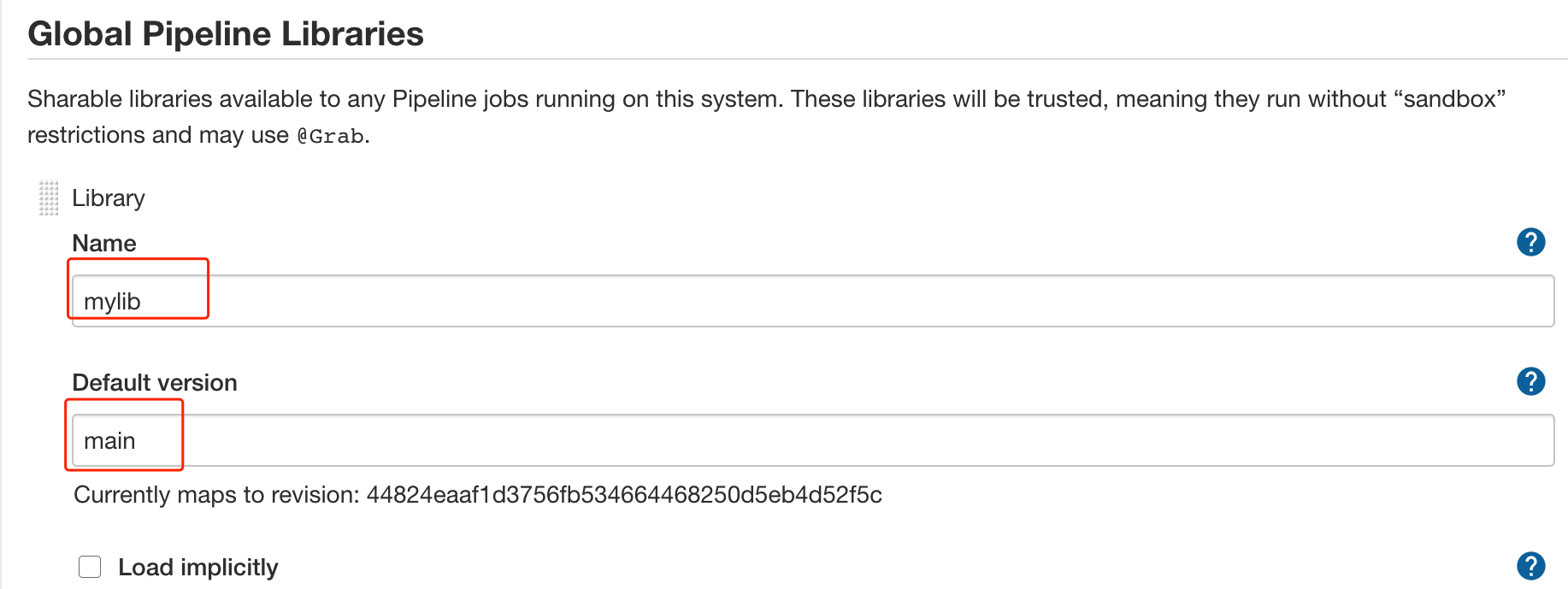 首先,为共享库设置一个名称 mylib (自定义,无需与gitlab仓库一致),注意这个名称后续在Jenkinsfile中引用,再设置一个默认的版本,这里的版本是分支的名称,我这配置的是main版本。
