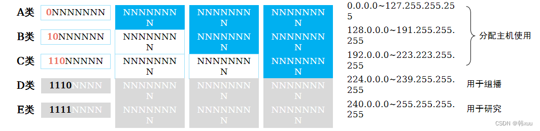 - D类:224.0.0.0 ~ 239.255.255.255(组播地址)