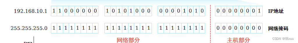 - 主机部分:用来区分一个网络内的不同主机,能唯一标识网段上的某台设备,处于低位。