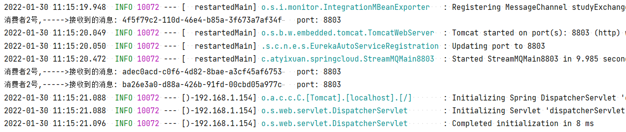消费者2号,----->接收到的消息: 6172e3ed-cf65-466d-aefa-a5f0d93d95c0 port: 8803