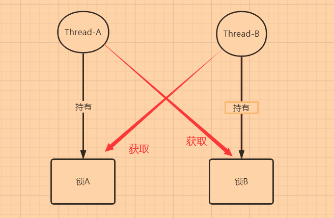 线程A持有A锁,线程B持有B锁,线程B尝试获取A的锁,线程A尝试获取B的锁