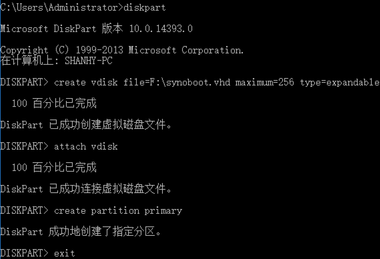 create vdisk file=F:\synoboot.vhd maximum=256 type=expandable