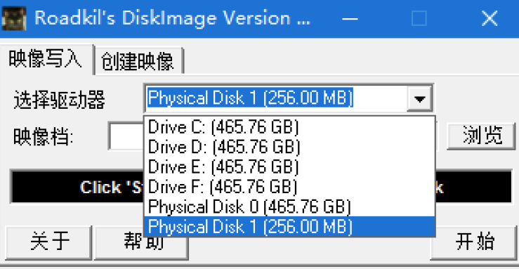 使用Roadkil's DiskImage将img文件写入刚刚创建的虚拟磁盘,选择一个256M的驱动器,那个就是我们刚刚创建的虚拟磁盘,映像那里选择我们的img文件,点开始。如果在实体机上安装也使用这个软件同样的方法将img写入U盘即可。