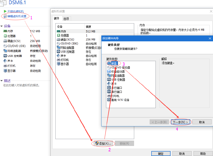 后面可以选择虚拟磁盘和物理磁盘,我电脑硬盘比较多,并且想让群晖稳定高效的运行,所以我试用物理磁盘。使用物理磁盘要先把磁盘从系统中卸载掉。步骤为打开cmd命令提示框,